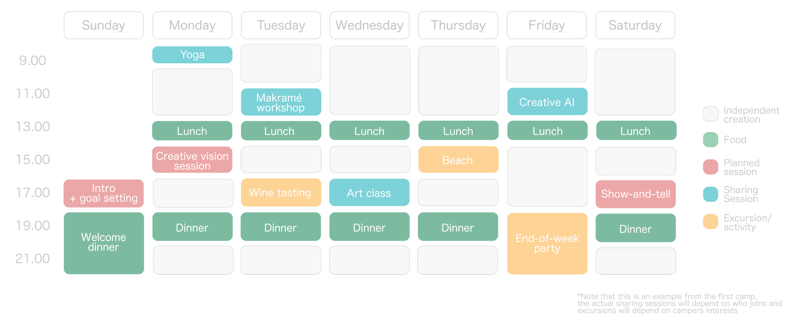 This is an example of the schedule from a previous creative camp. The exact schedule will depend on what sharing sessions campers want to run and which excursions the group find the most interesting.